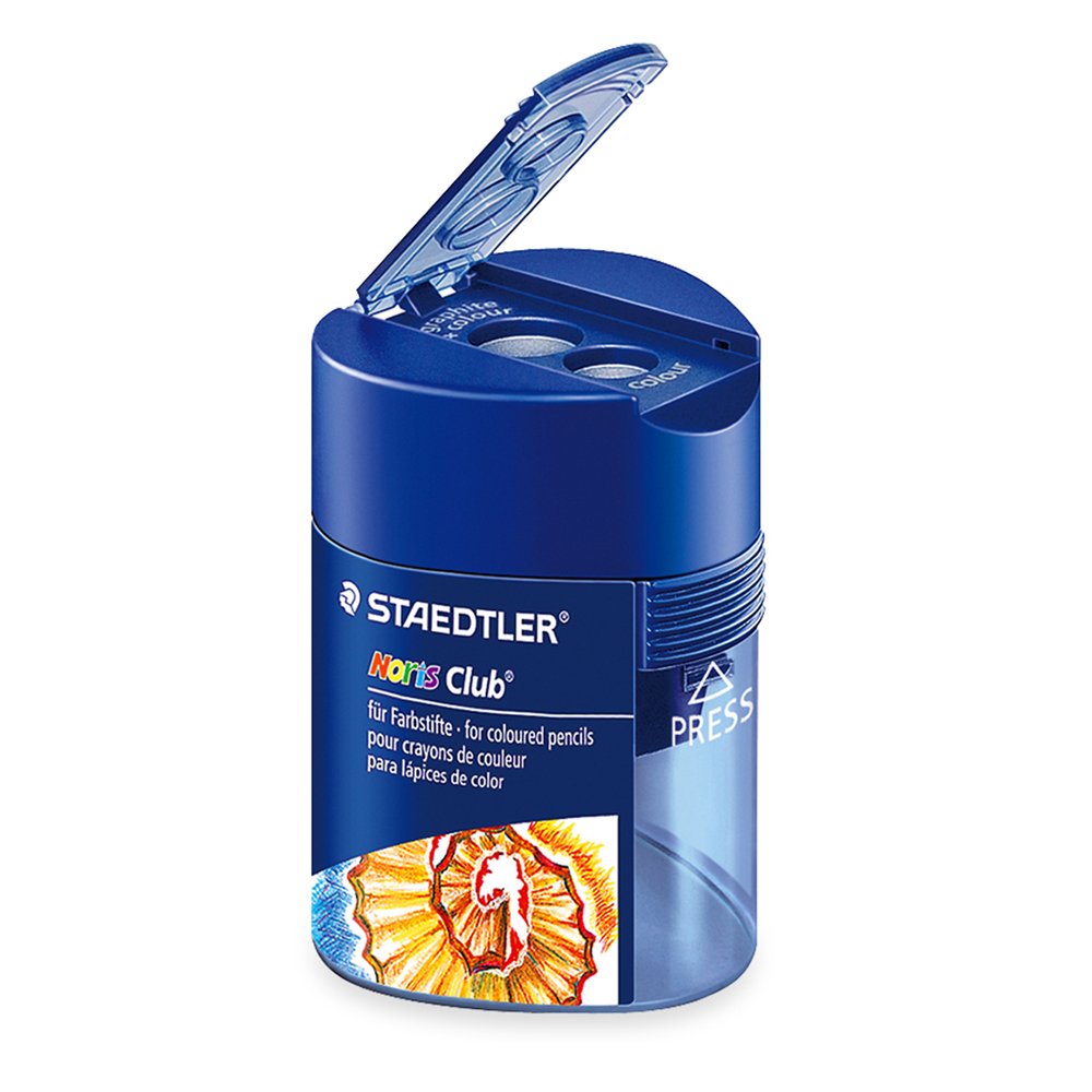 37 ステッドラー/鉛筆削り ノリスクラブ 512 128 三角筒型 本体に三ヶ所で固定された刃を内蔵。刃のがたつきが少なく切れ味がとてもシャープです。削りカスが落ちないように開閉式のカバーを付属。容器が簡単に抜けないようプッシュ式ボタンを装備。鉛筆、色鉛筆、太軸鉛筆用2穴タイプ。